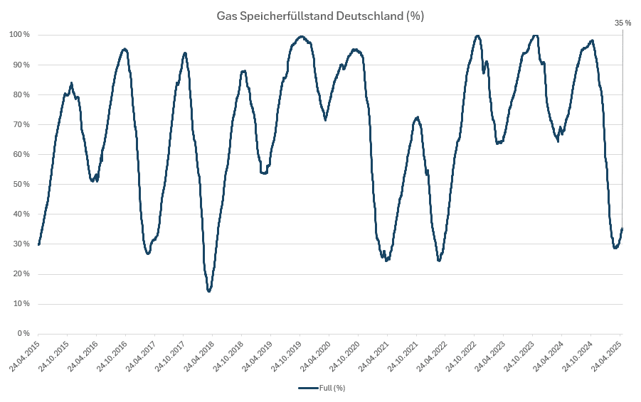 Aktuell beträgt der Füllstand der deutschen Erdgasspeicher 35 %. In der letzten Woche lag der Wert bei 34%.