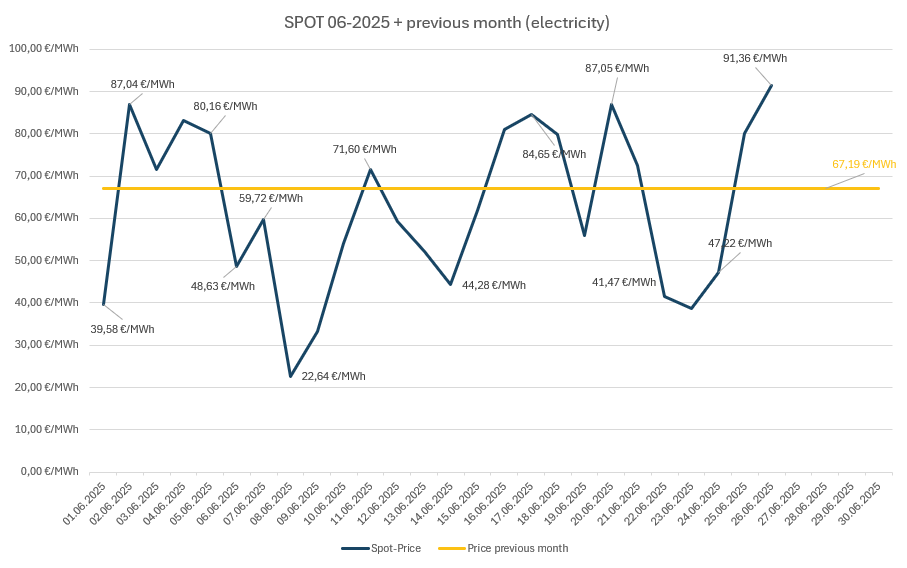Der Juni mittelt derzeit bei 6,1 ct/kWh. Der Vormonat Mai wurde mit einem Mittel von 6,7 ct/kWh abgeschlossen