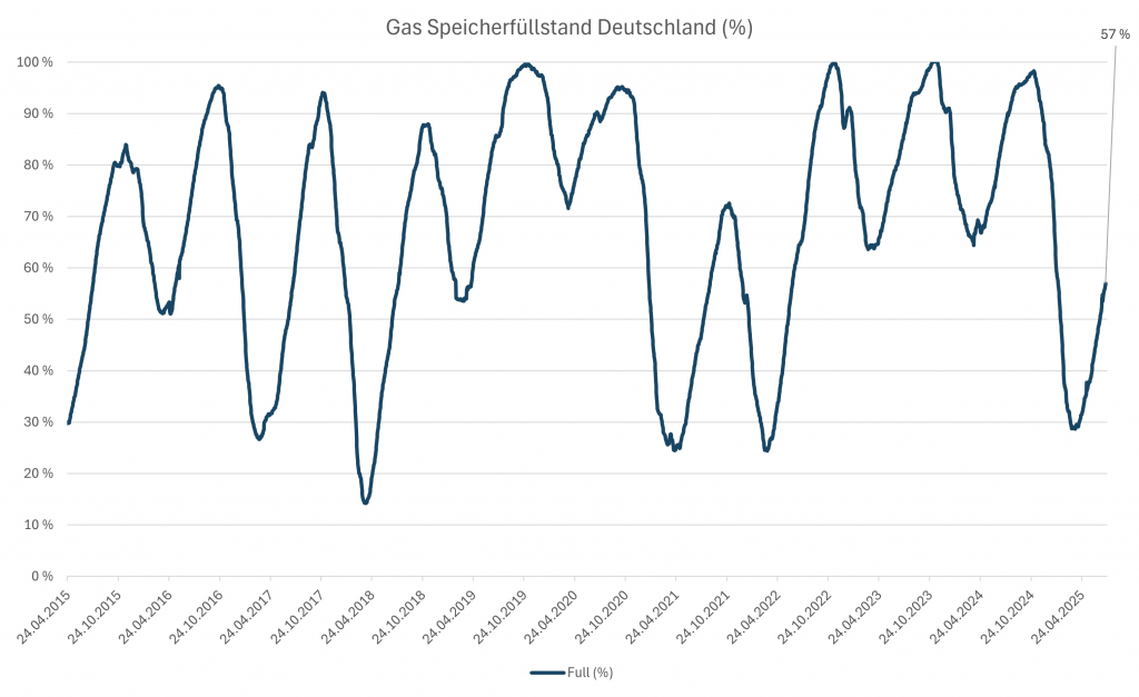 Aktuell beträgt der Füllstand der deutschen Erdgasspeicher 59 %. In der letzten Woche lag der Wert bei 57 %.
