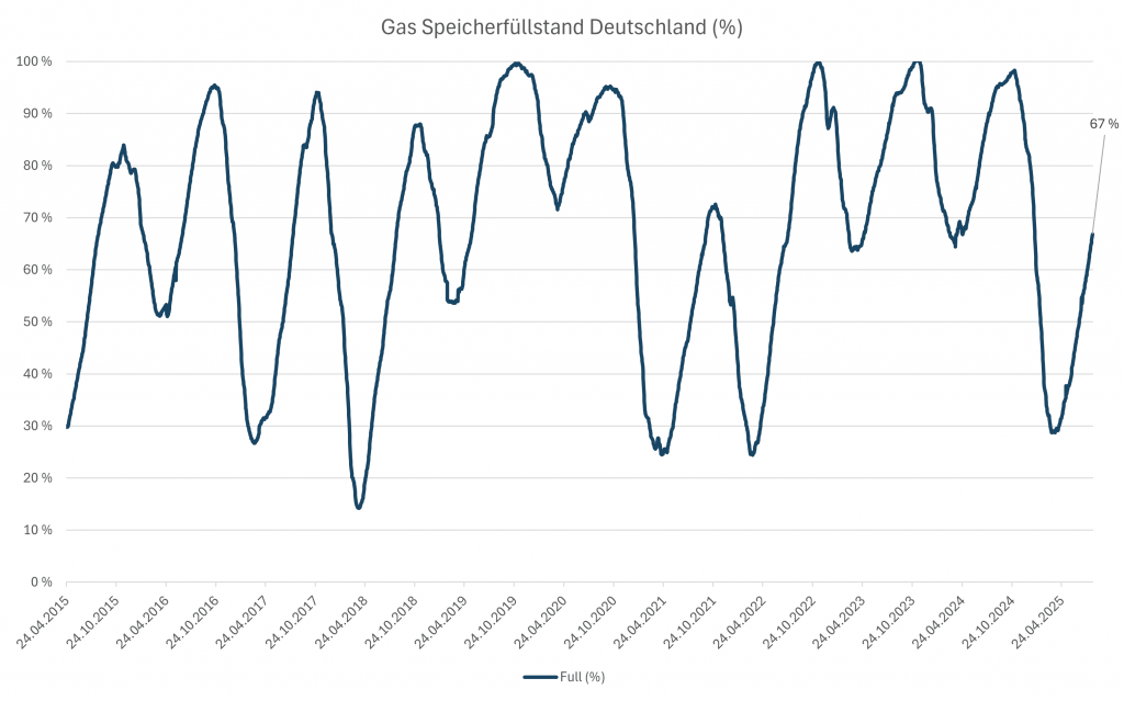 Aktuell beträgt der Füllstand der deutschen Erdgasspeicher 67 %. In der letzten Woche lag der Wert bei 65 %.