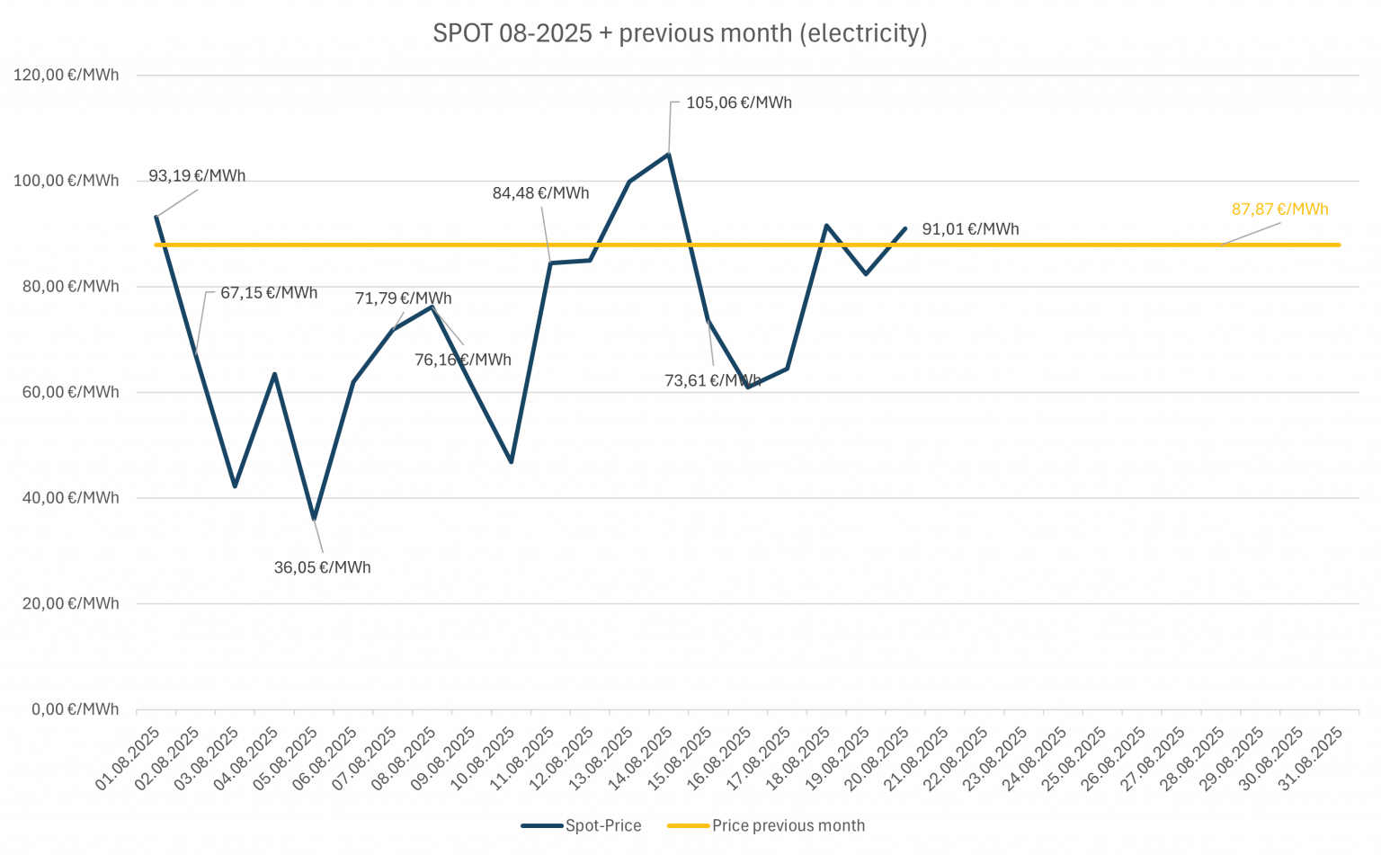 Der Monat August mittelt derzeit bei 7,3 ct/kWh.