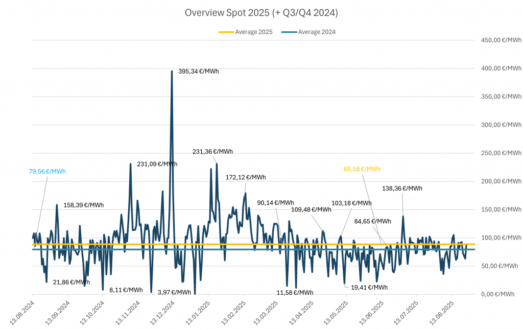 Das Jahr 2025 mittelt derzeit somit bei ca. 8,8 ct/kWh. Das Jahr 2024 wurde mit einem Durchschnittspreis von 7,9 ct/kWh abgeschlossen.