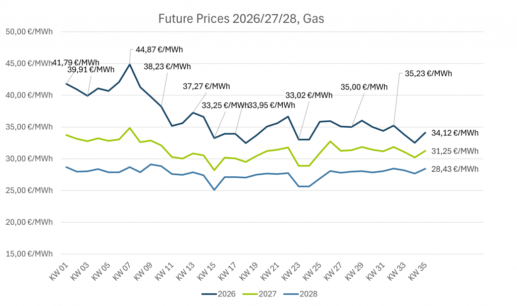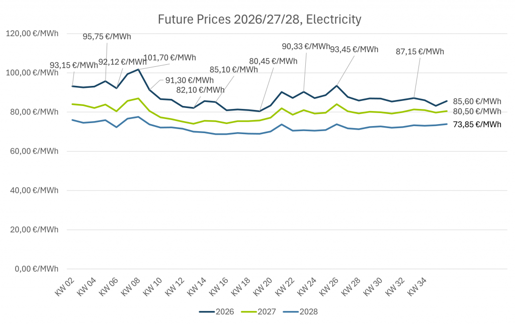 Das Frontjahr 2026 wird aktuell für ca. 3,4 ct/kWh gehandelt.