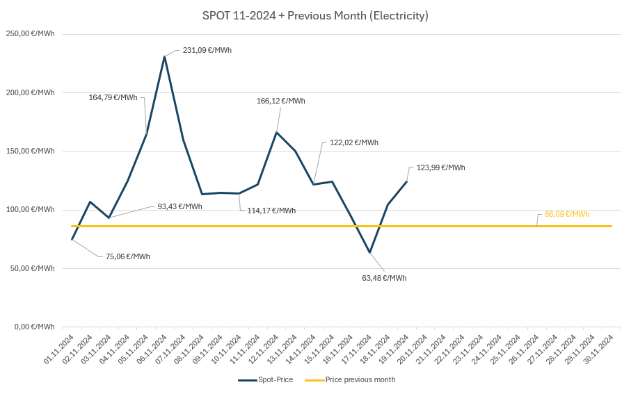 Der November mittelt derzeit bei 12,4 ct/kWh. Der Vormonat Oktober wurde mit einem Mittel von 8,6 ct/kWh abgeschlossen