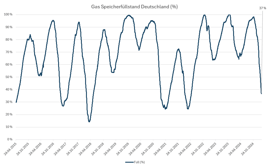 Aktuell erreichen die deutschen Erdgasspeicher weiterhin einen Füllstand von 37 %.